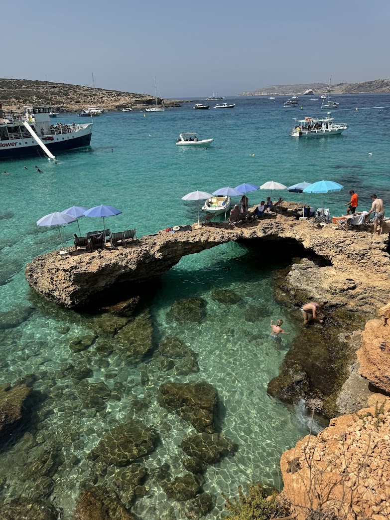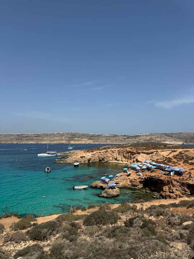 Wie am Vortag fuhren wir mit dem Auto in den Norden der Insel, um von dort aus mit einem kleinen Boot nach Comino überzusetzen. Die Boote verkehren in regelmäßigen Abständen, was die Organisation unkompliziert machte. Auf Comino angekommen, wurden wir direkt mit dem „Massentourismus par excellence“ konfrontiert: unzählige kleine Stände, die Essen und Getränke anboten, und eine große Anzahl an Booten – privat wie organisiert –, die in der Lagune festgemacht hatten.