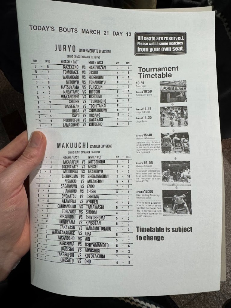 Jeder Kampf beginnt mit traditionellen Bewegungen – stampfen, Salz streuen, konzentrierte Blicke. Das kann sich mitunter ziehen, ist aber faszinierend zu beobachten. Die Kämpfe selbst sind kurz, oft heftig – und manchmal spektakulär, wenn einer aus dem Ring gefegt wird. Zwischen den Matches gibt es längere Pausen, was je nach Sitzplatz auch mal zäh sein kann.